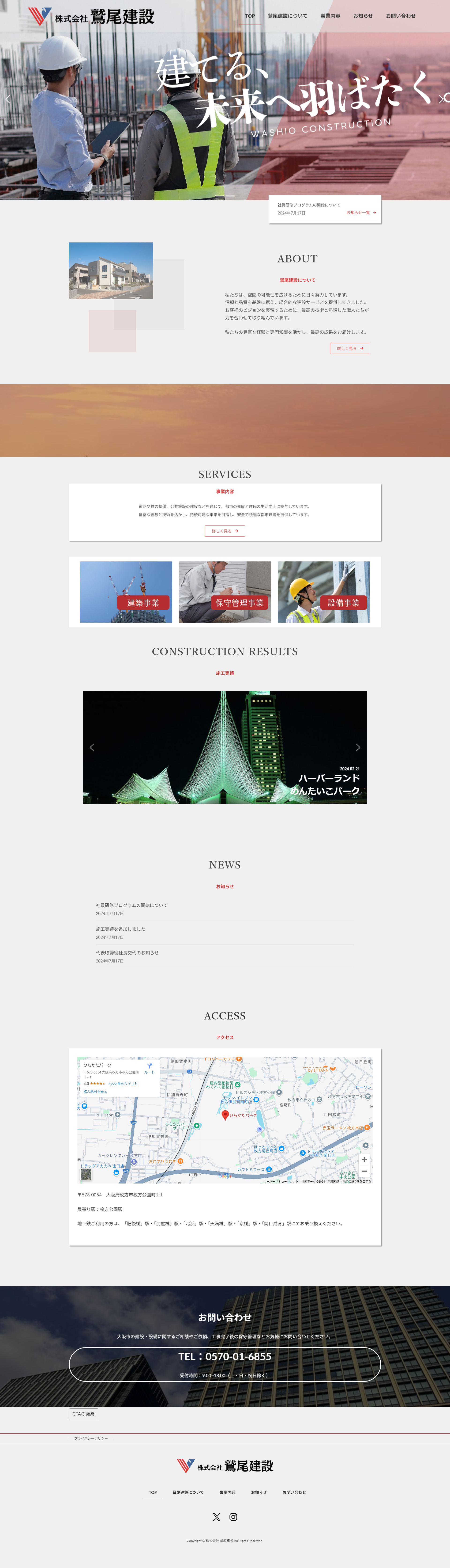 建設会社 鷲尾建設様(架空)のコーポレートサイトを制作しました。